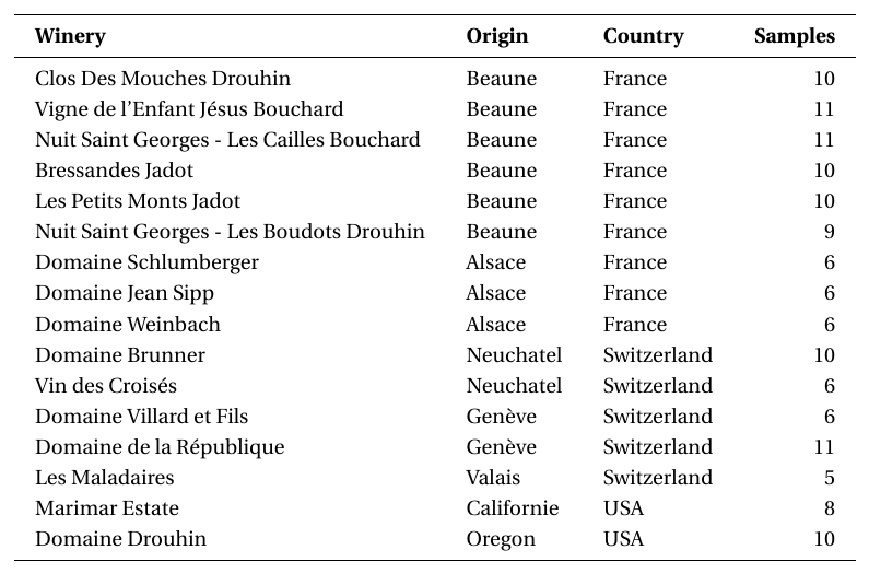 In this section, we focus on the classification of Pinot Noir wine samples. The goal is to predict the winery, origin, country, or continent of each sample based on its GC-MS chemical profile.